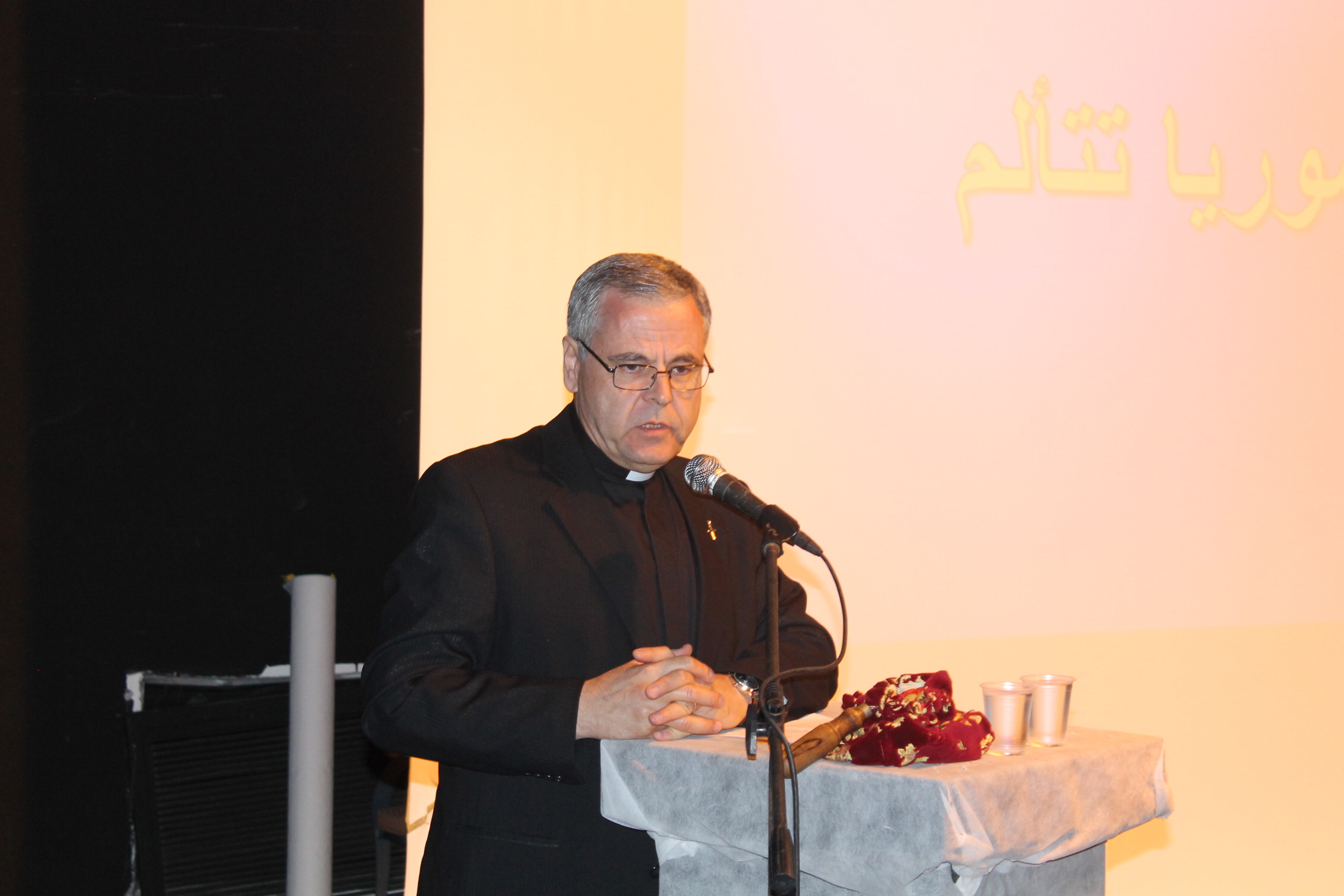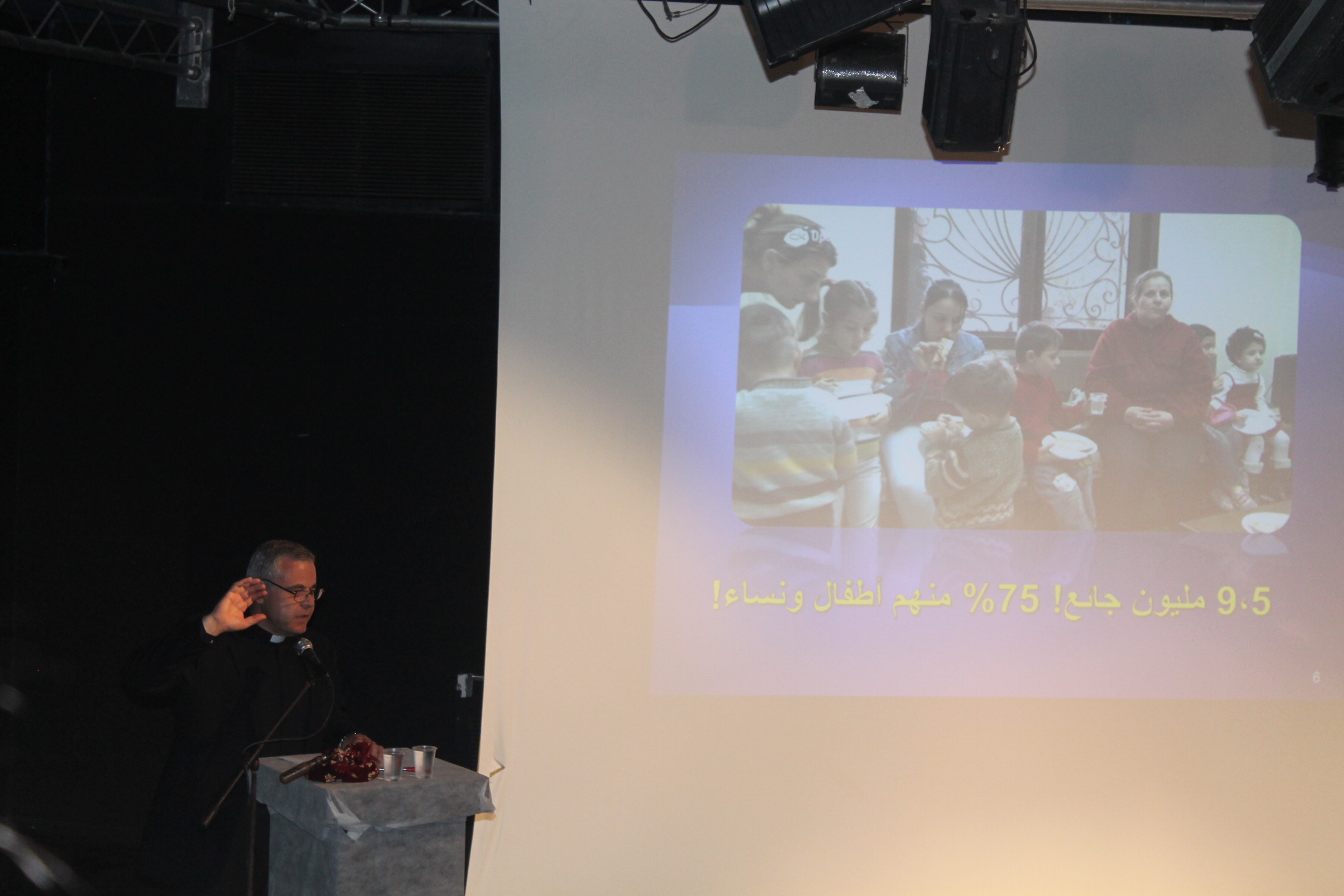 ومن ثم قام القس نشأت حداد - ضيف كنيسة عمانوئيل- وهو من أصل سوري- باستعراض الوضع السوري الحالي من خلال صور وارقام تتحدث عن اوضاع الفقر ،القتل والارهاب.
